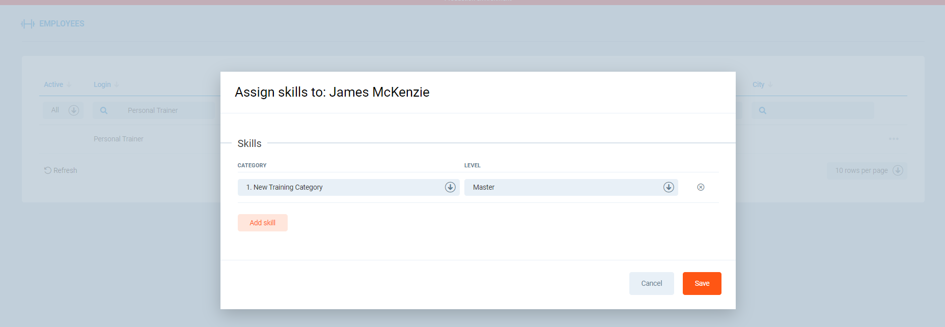 - The last step regarding the Skills is to make sure that the Personal Trainer will be able to conduct this class, so he/she has the proper skills assigned to the PT definition. Make sure you add the right skill category and level in the PGM -> Employees -> Employee Skills: