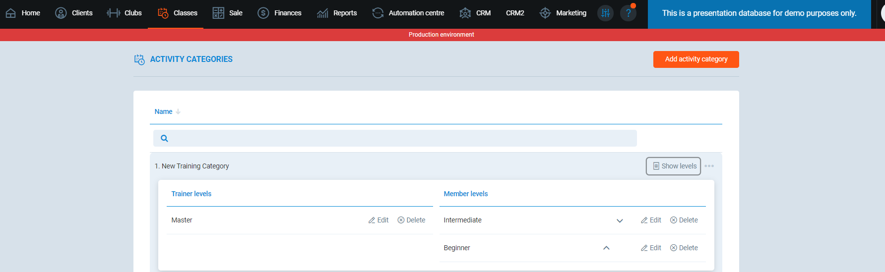 - First, you set a certain activity category; the Category Name is: New Training Category in the PGM -> Classes -> Activity categories:
