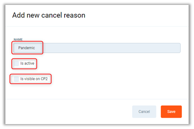- Is Visible on CP2 - Can this cancel reason be used on Client Portal, if unticked it can only be used on PGM.