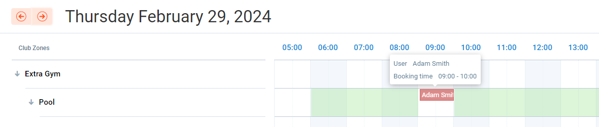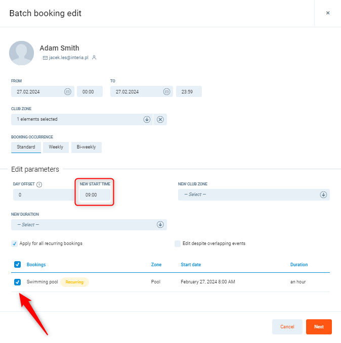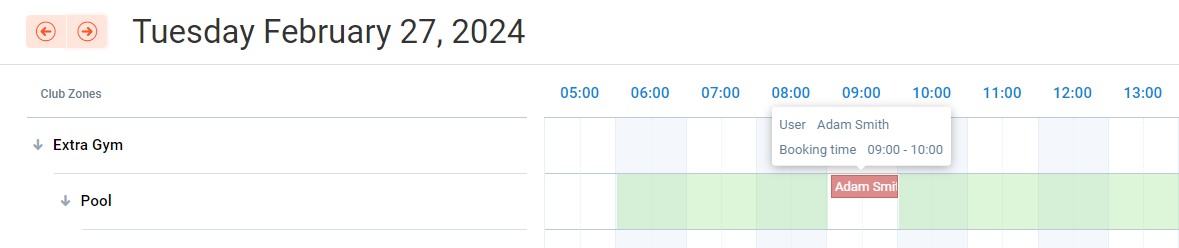 In this example, we have the two bookings at 08:00 AM on Tuesday and Thursday in zone Pool. We want to move the start dates to 09:00 AM.