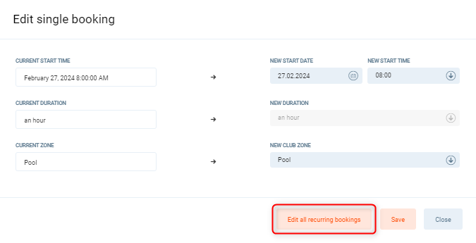 2. You can still edit this single booking. However, if you want to edit all of the recurring bookings linked with that booking, you can click the Edit all recurring bookings button. You will see the Batch booking edit window with automatically filled fields.