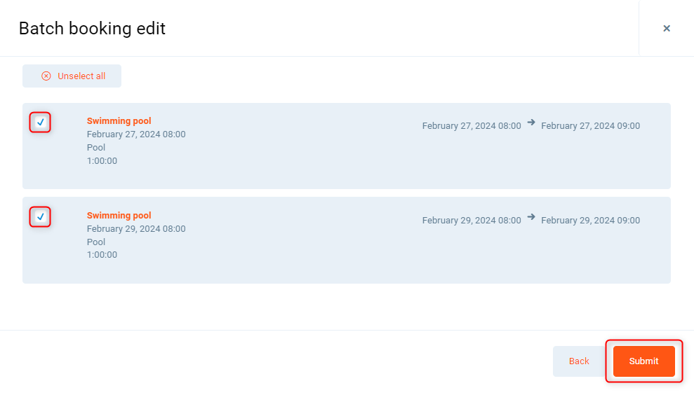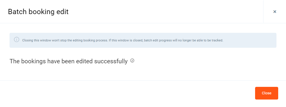4. You can select bookings one by one or use the Select all button and click Submit. After that you will see the new pop-up window with status. You can close the window an or wait for success message.