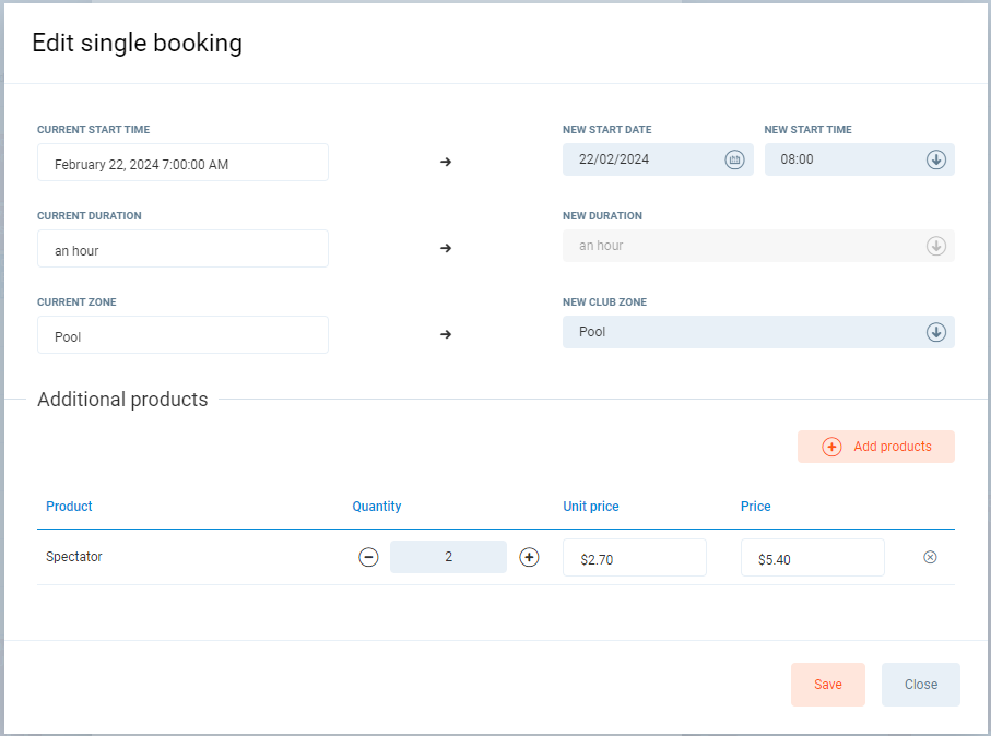 From the R92 system version, this screen will show additional services attached to the selected booking, and will allow to edit the list of products.