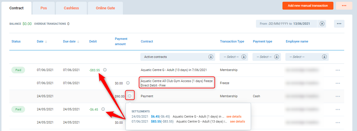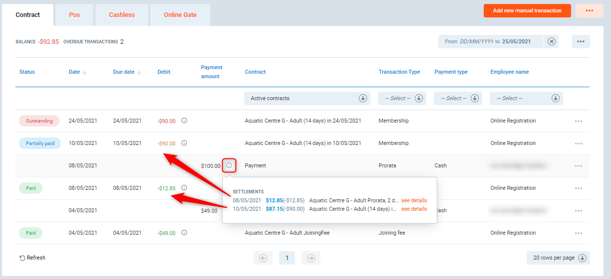 - Depending on the configuration of your system, settlements/payments may carry over to other contracts on the same user. With Family contracts, if a debt is on the child, it will only stay on the child.