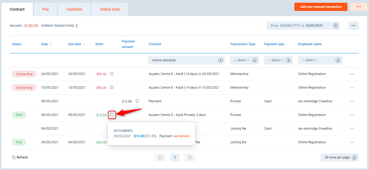Contract transactions also have the information icon, which will track which payments are used to pay for this transaction.