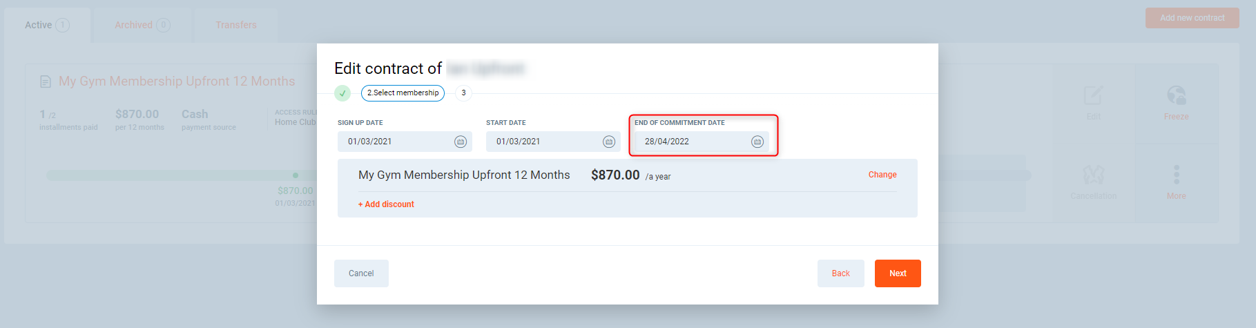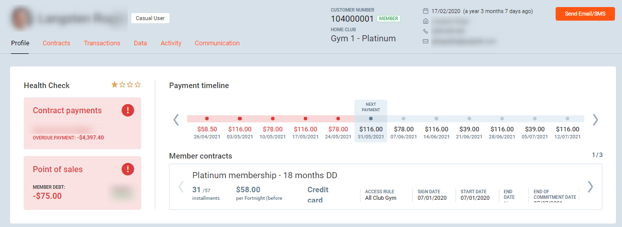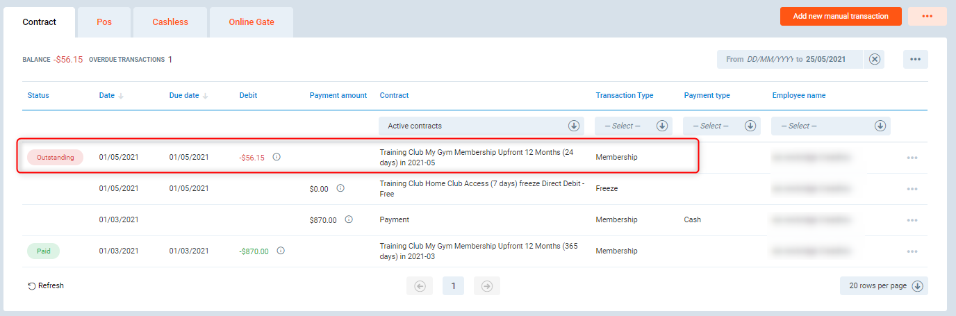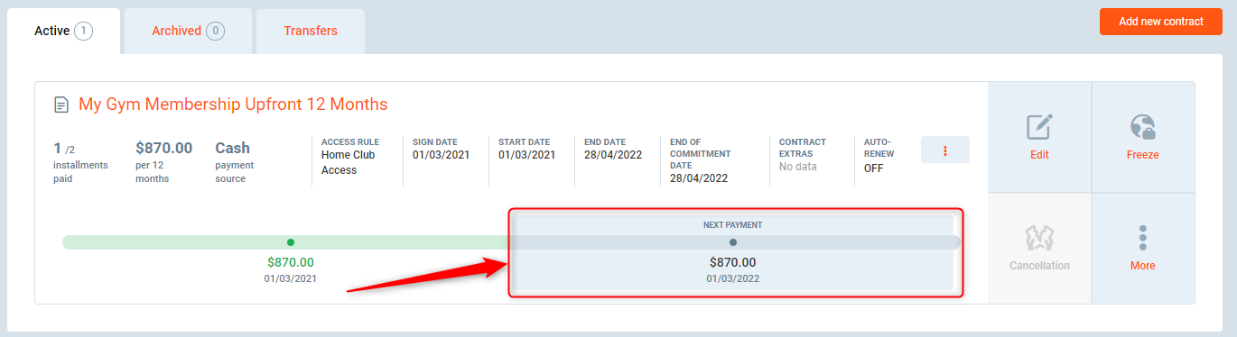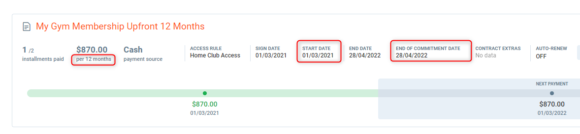 In this example, the club member has an upfront/paid in full contract where the first payment is done on sign up date and no additional payments are needed.