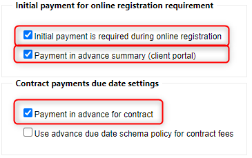 In the payment plan set up for upfront/paid in full contracts, the following settings must be used so that the upfront/paid in full contract can generate properly.