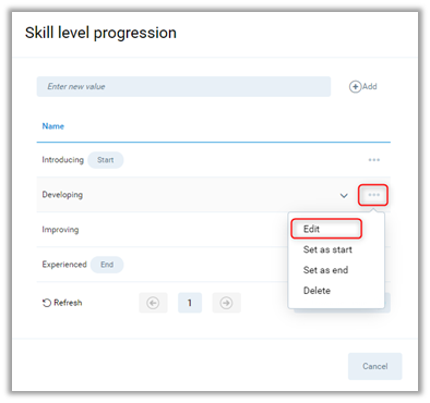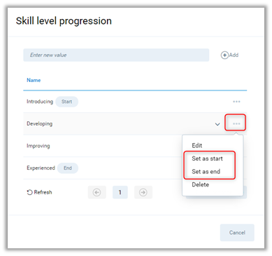 To set a skill progression to the start or end, press ●●● then select Set as start or Set as end.