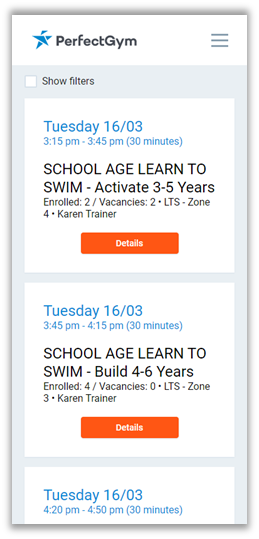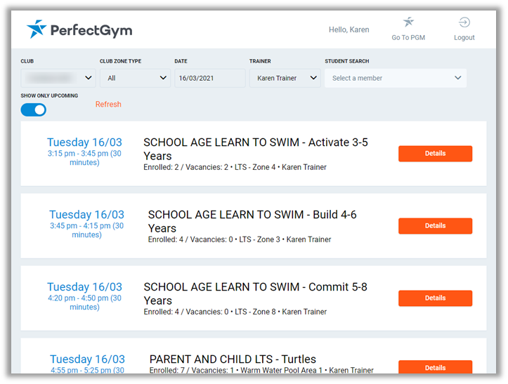The Trainer portal will allow the instructor to view their upcoming lessons, see who is attending, mark presence and assign new skills and levels.