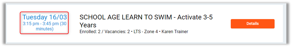 Time/Date of the class, with class duration.