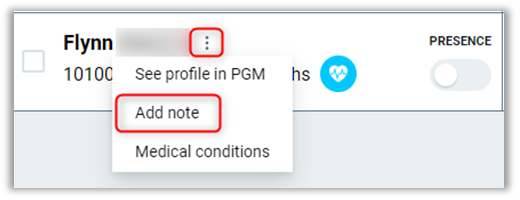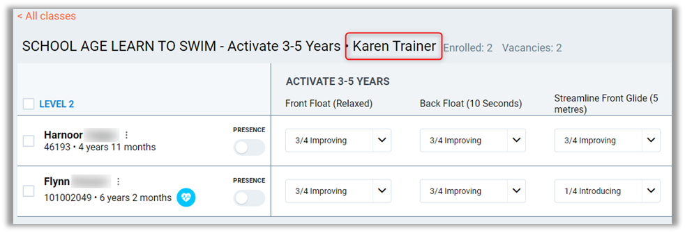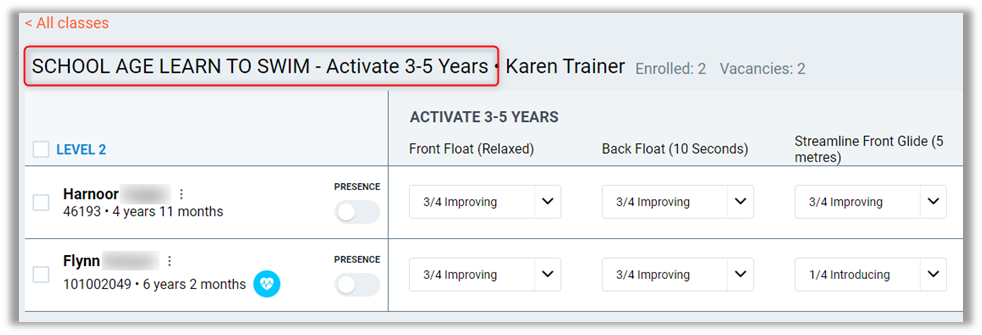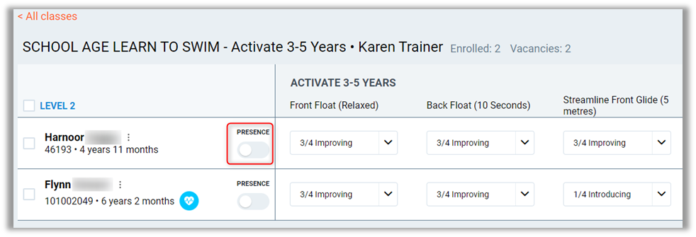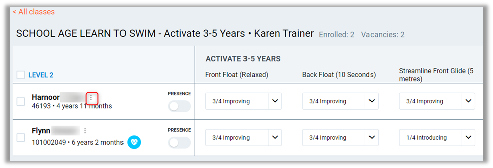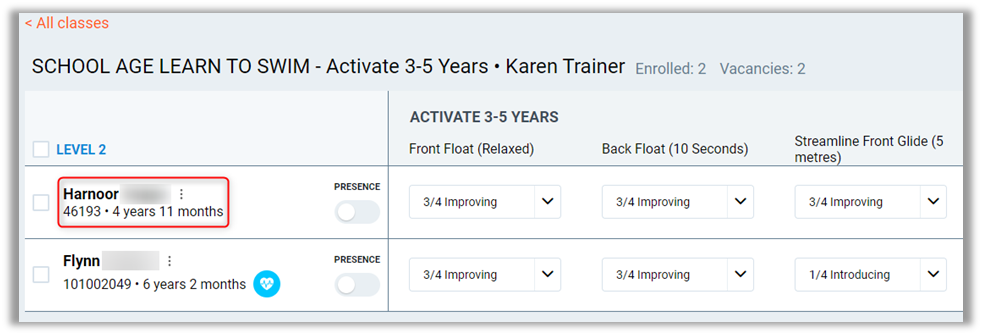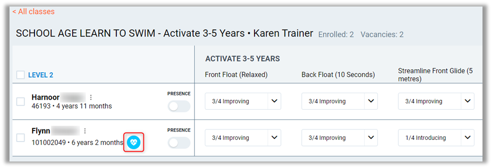 Medical Condition – If a student has a medical condition against their profile, this will display an icon alerting the instructor about it.