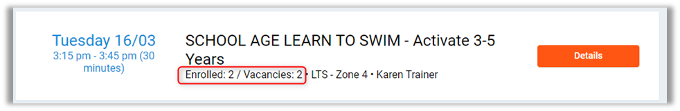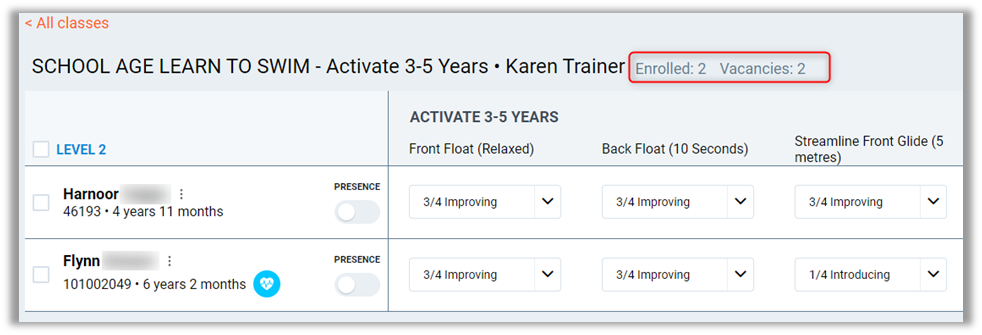 Members currently enrolled in a class, and how many vacancies are remaining in the group.