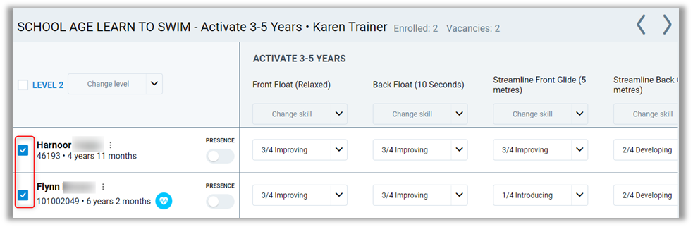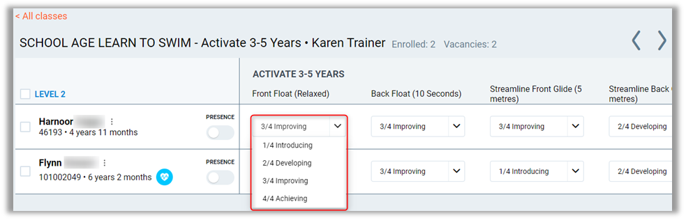 Note: On mobile phones, only attendance can be recorded. Skills cannot be modified.