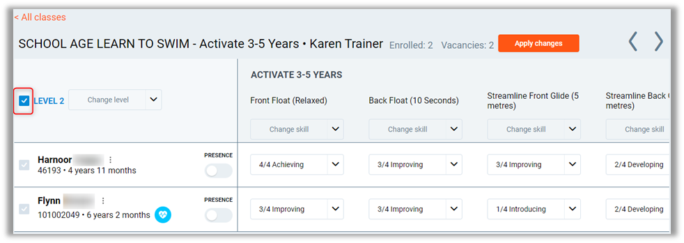 Ticking the box next to the member's name will modify all selected members at the same time for skill and level progression.