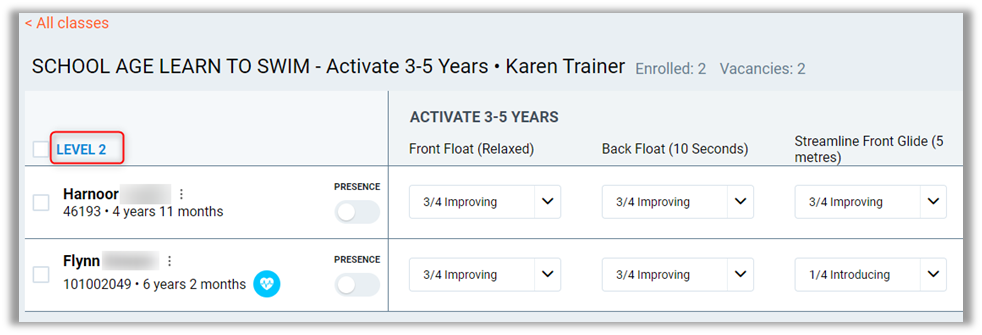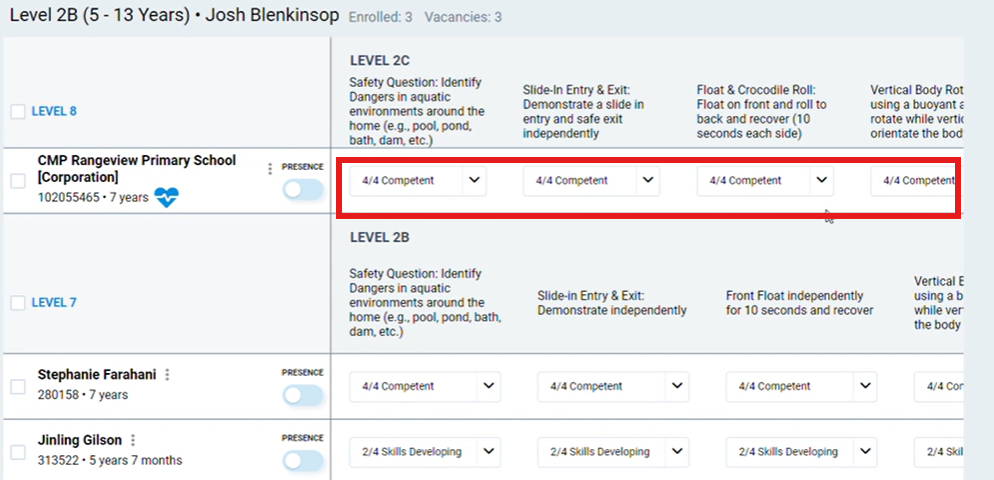 Skills (Individual) – This will mark the student's individual skill progression. If all skills are at the top level, this will automatically move the student to the next level.
