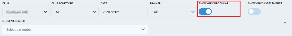 Show only upcoming – View only upcoming classes. If turned off this will show all classes on the date selected. The default is to only show upcoming classes.