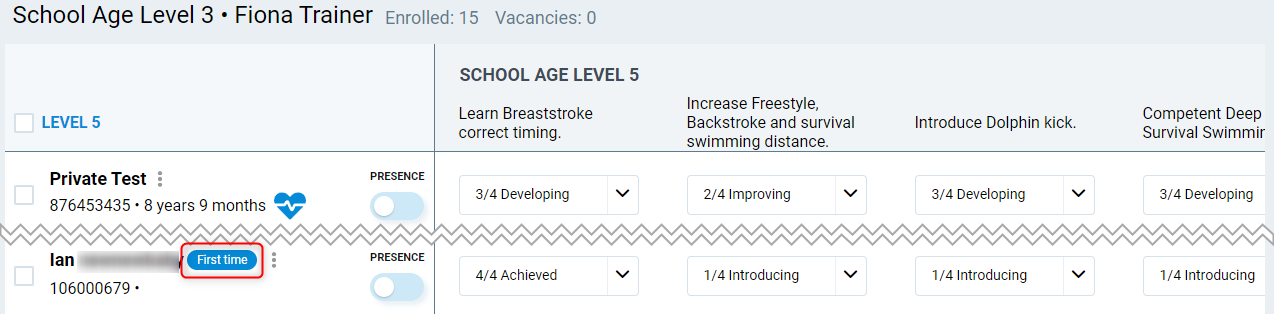 First Time – If a student is attending their first class (specific to the activity category), this will display the words 'First time' alerting the instructor about it.