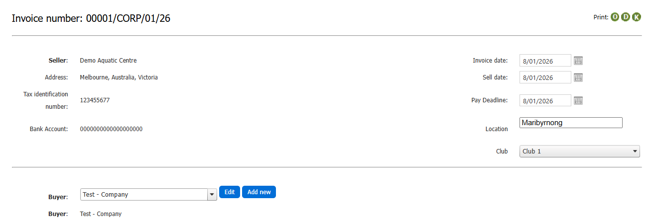 In the Club dropdown, select the location issuing the invoice. Seller details will populate automatically.