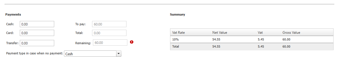 Cause: The sum of the entered payments (Cash, Card, Transfer) exceeds the total gross value of the invoice, resulting in a negative "To Pay" balance.