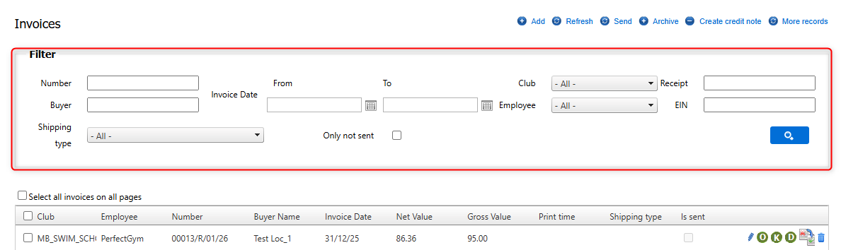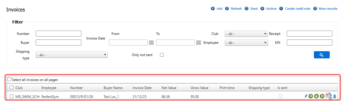 Steps: Check the Select all invoices checkbox at the top of the grid. Click the Send button. Confirm the action.