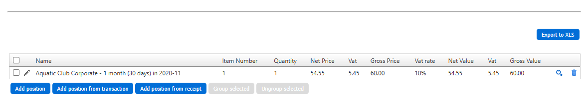 Add Position: Opens a modal to manually enter item Name, Quantity, Net/Gross Price, VAT Rate, GTU, and Accounting Code.