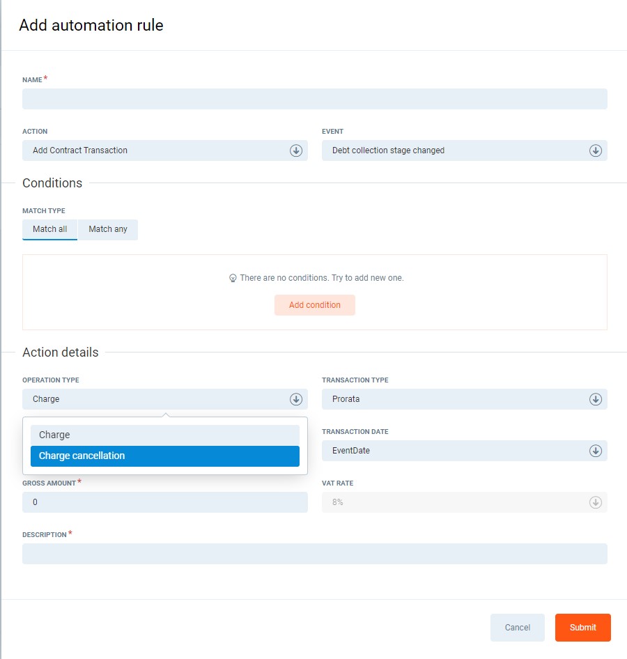 Fill all fields in Action Details section about the type of transaction. For now only Charge and Charge cancellation transactions are available. A new debit transaction will be added to user’s contract with Transaction Date equals to date of changing debt collection stage, which is EventDate.