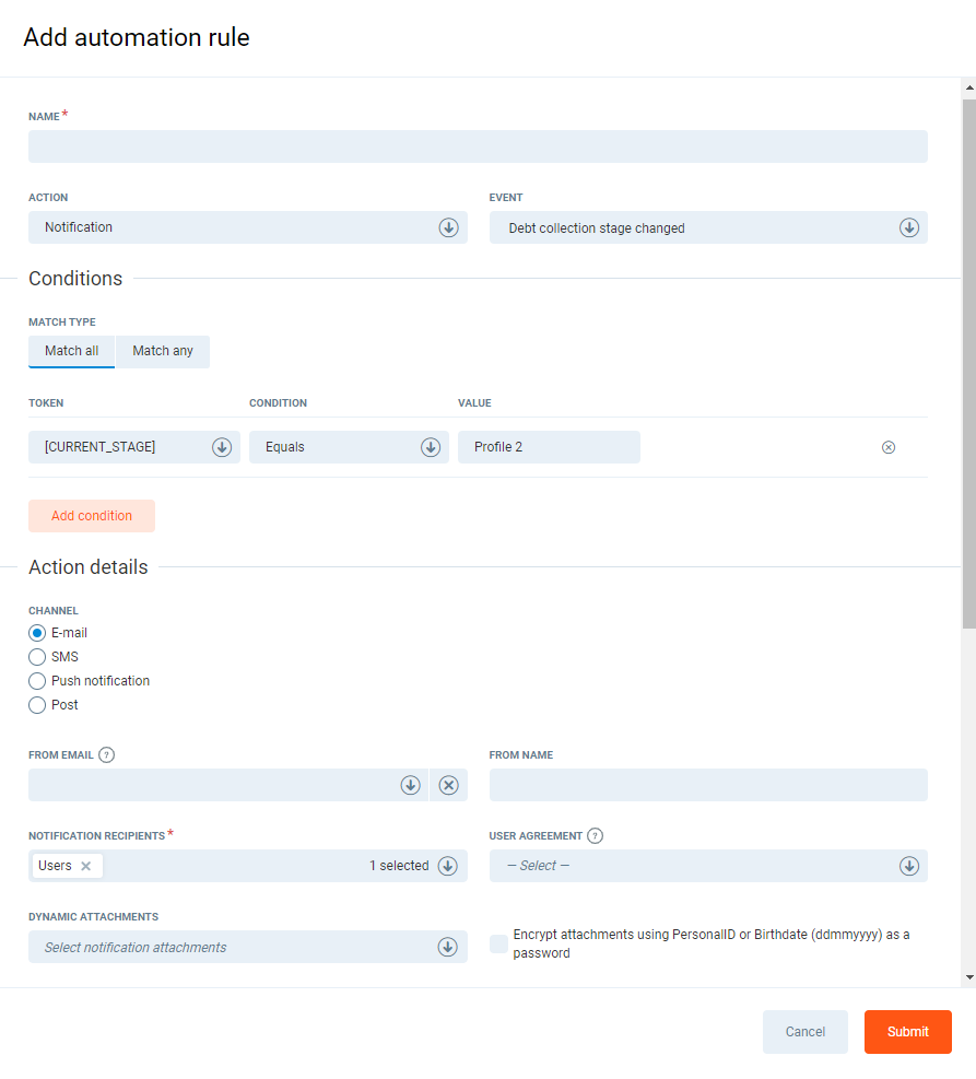 This action is no different than setting any notification rule in AC, but with additional conditions as tokens. For example, set a notification as email to inform users that they entered debt collection process. You can add a custom message for each stage with tokens or if you do not add any Conditions the same message will apply to every single stage.
