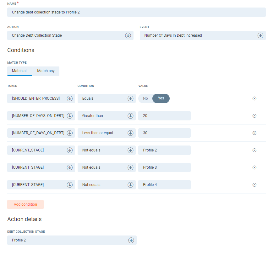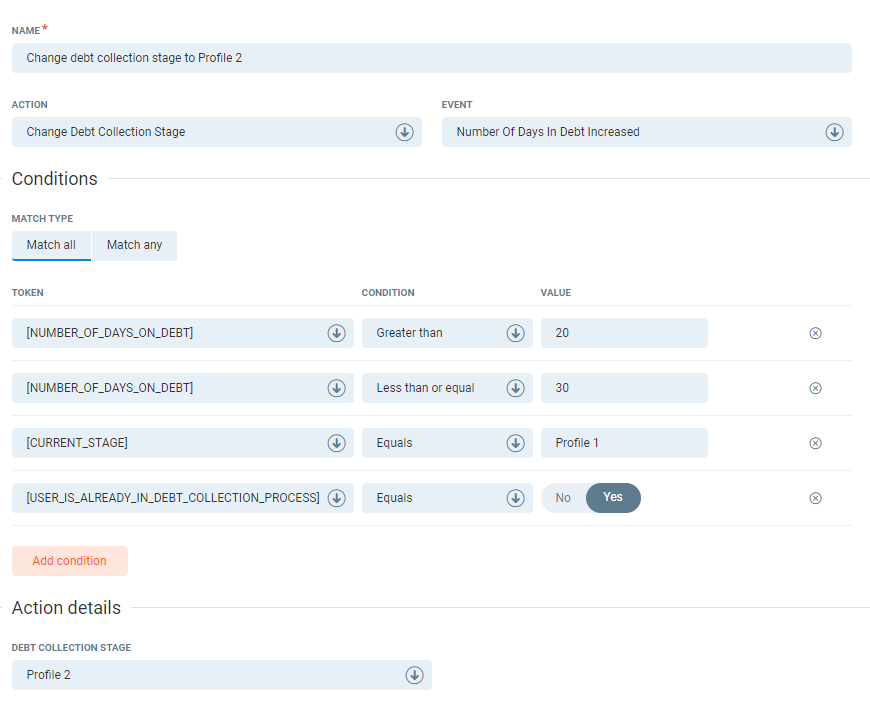 In the example above, each user who is a debtor for 21 to 30 days, and will automatically change debt stage for 'Profile 2', but only if he/she is a debtor on stage below 'Profile 2' or none at all.