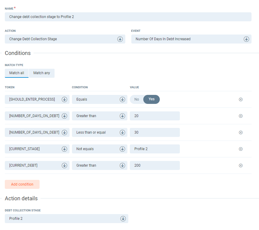 These values are setup as tokens in Conditions section. If we want to specify time range for specific stage, 2 conditions must be added for the same token. The same rule applies if we want to configure stage based only on debt amount, we need lower and upper boundary of range.