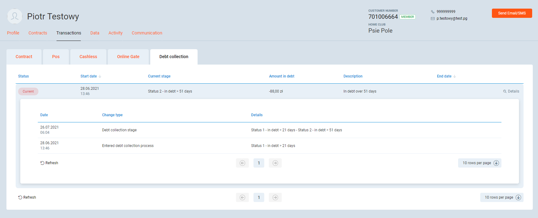 Debt collection history and current stages for user can be tracked on member profile in PGM → Transactions → Debt collection