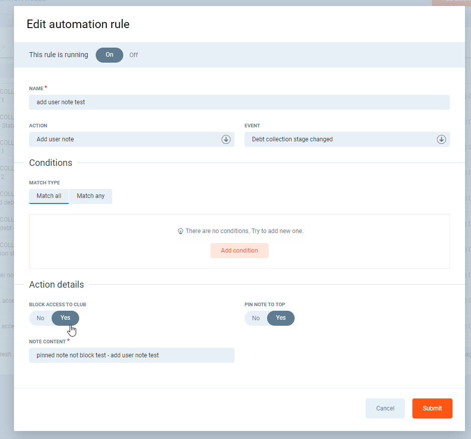 This action allows you to automatically add a note to the user profile. This Action has same capabilities as adding notes in Member Profile manually.This feature also allows you to block an access to the club.