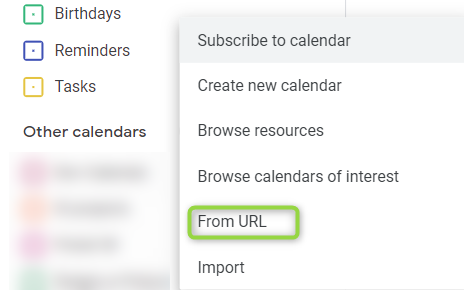 4. Go to your calendar app and find the subscription option and adding the calendar From URL option (below the example from Calendar Google):
