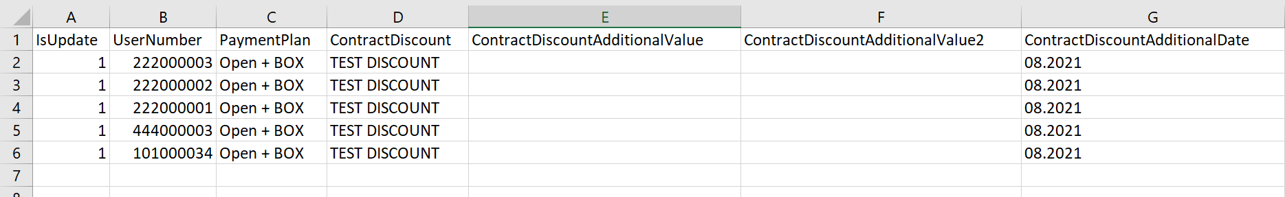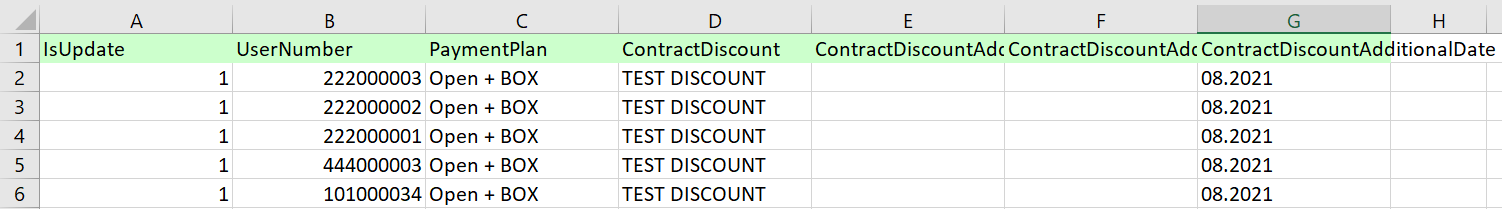 - Column G - ContractDiscountAdditionalDate - set the date that's related to discount. In case of a discount for one chosen month type in the month that should be cheaper. Format: DD.MM.YYYY