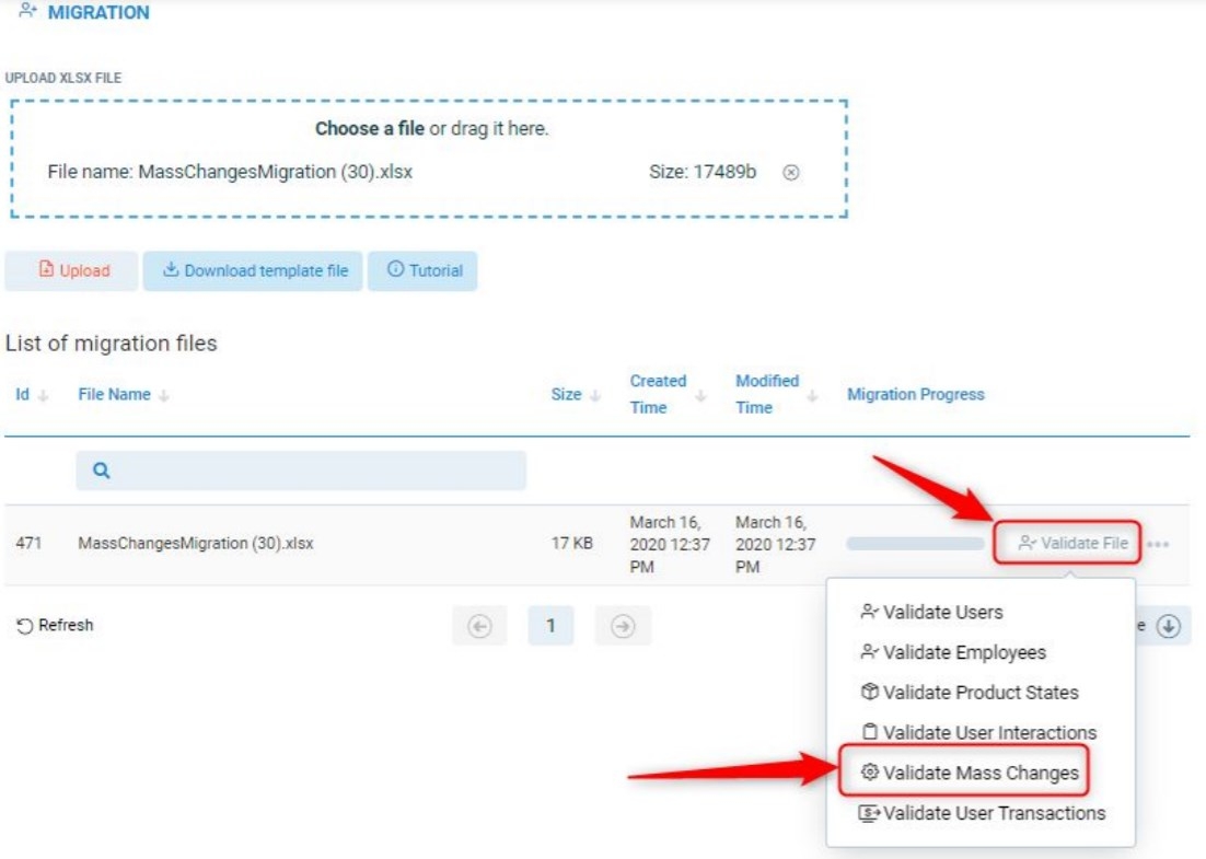 1. Click on Validate File to ensure the correctness of the data entered. Next, click on Validate Mass Changes. This will cause file validation and its copy download.