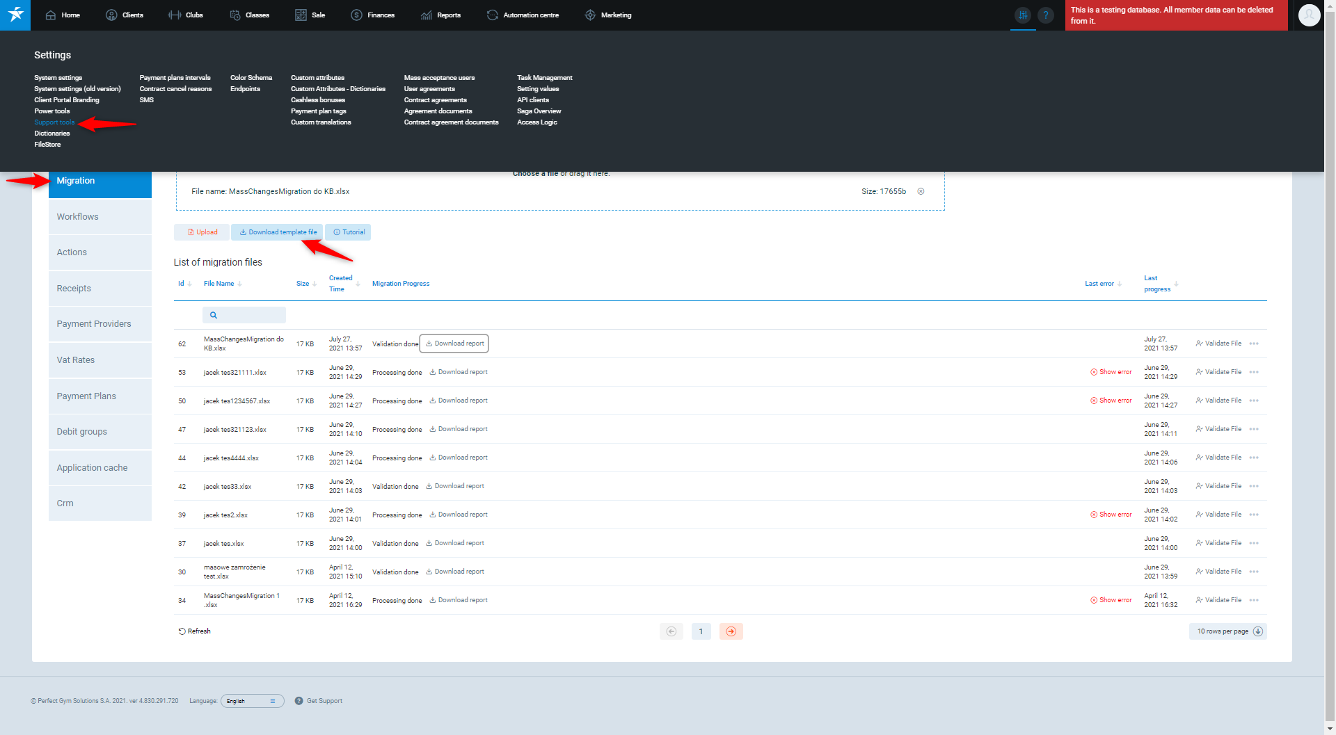 The whole process may take from several minutes up to few hours, depending on the data load to be changed. If the value in the Migration Progress column will not be changing, refresh the page. In case of any doubts, or issues, please contact the PerfectGym Support Team by use of the Get Support tool.