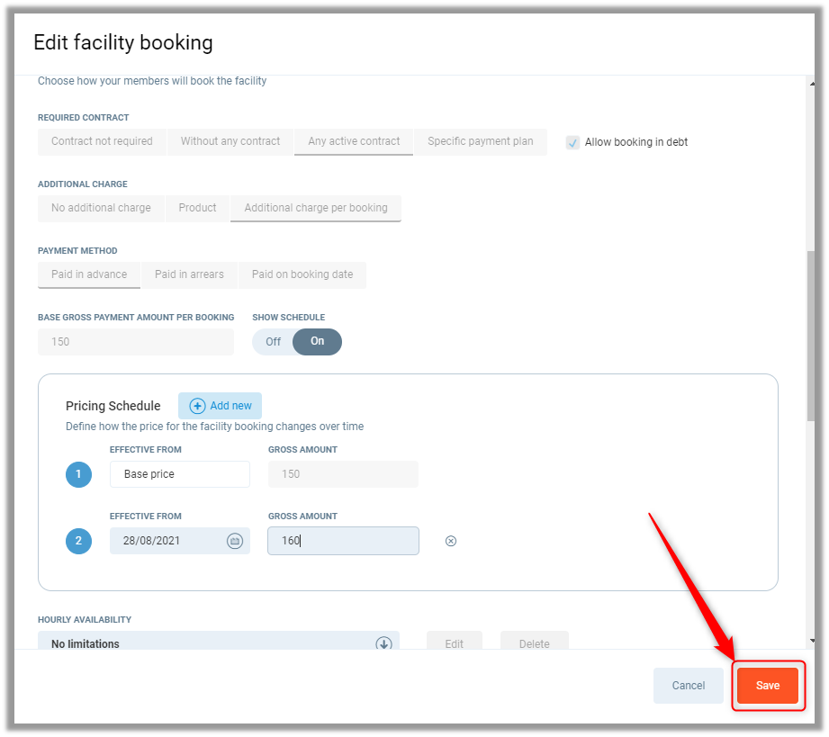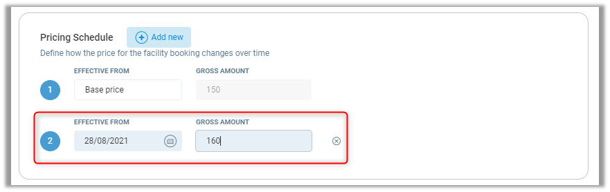 If a new schedule was entered in for $160 per interval with an effective from date of 28/08/2021, this will change the price of all bookings to the new price using this rule where they are using the facility on or after 28/08/2021.