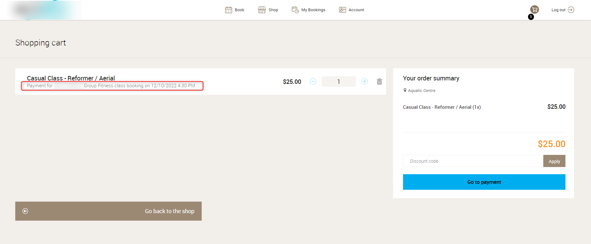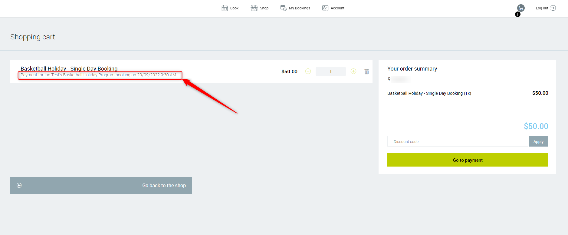 In the shopping cart screen, the club member and booking details will be listed below the payment line.