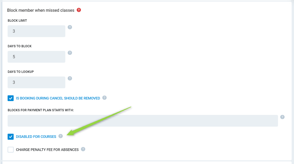 Block Limit - Enter the number of classes missed which will activate the blockade. For example if the member has enrolled into two classes and is not present in the class.