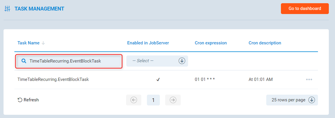 In task name, search for the task name - TimeTableRecurring.EventBlockTask.