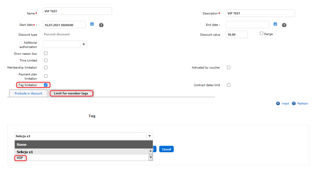 Tag limitation - after ticking this checkbox, a new Limit for Member tags tab will be displayed next to the Product in Discount tab. To set this parameter, go to the Limit for Member tags tab. This option allows you to limit Product Discount only to members with the specific Client Tags.