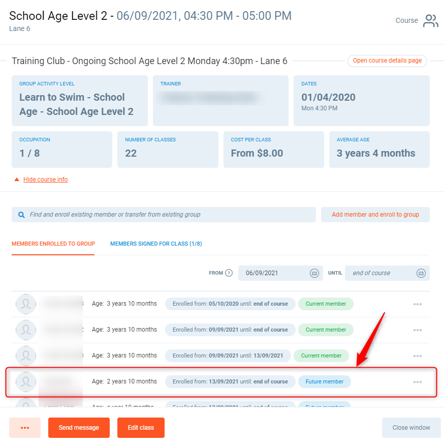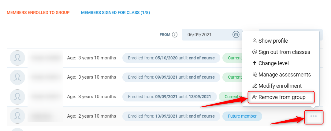 - If the club member was transferred into the group with a future start date, using remove from group will end their contract instead of deleting the contract. You will need to modify enrollment/remove end date on the previous group if they are continuing with the course.