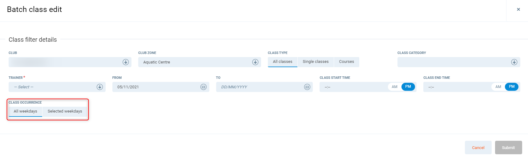Trainer - Select the current trainer, this is a required field as the main function of batch edit classes is to change the trainer/instructor.
