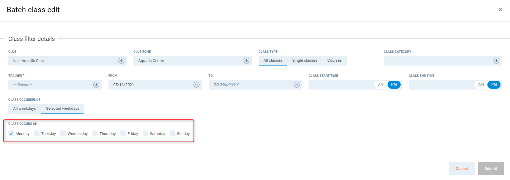 Class start time/Class end time - Select a time range on when the class are run, to only edit those classes.