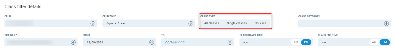 Class type - This will filter only selected class types.
