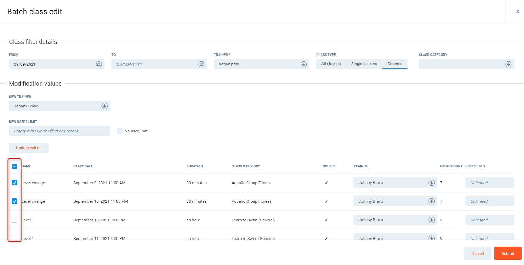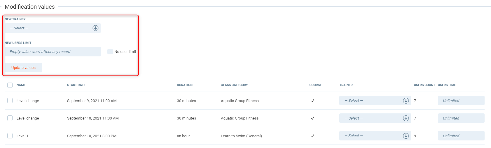 Listed below the mass update is the list of individual classes, where you can select the trainer or change the capacity of the class on an individual class.