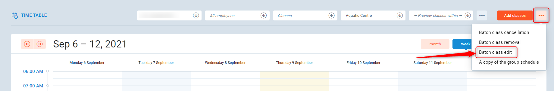 To batch edit classes, Go to PGM->Classes->Timetable to access the timetable then press the orange additional option button and press Batch class edit.