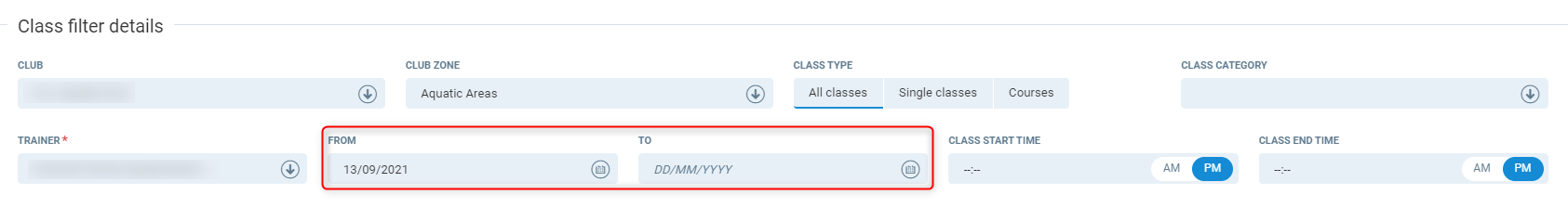 From - Select the from date, this will display all classes from this date. This is a required field and will default to current date.