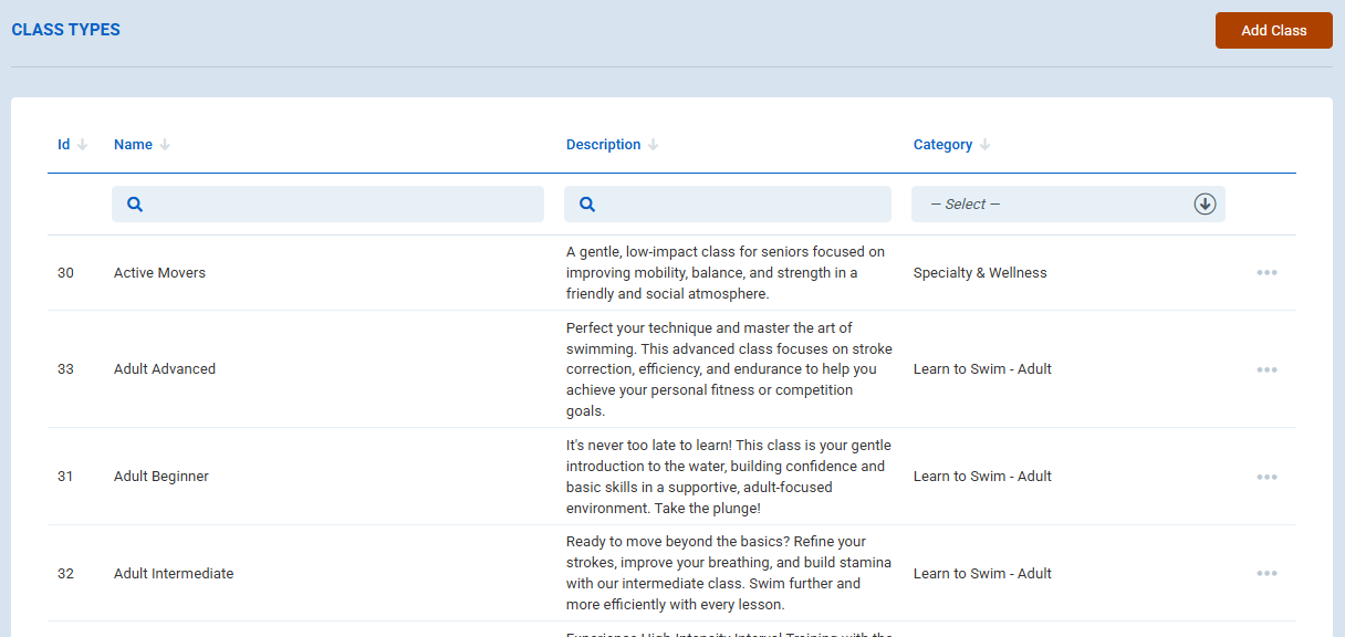 Category Column Filter: A dropdown menu in the Category column header that allows you to filter the grid to show only classes belonging to a specific category (e.g., only "Yoga" classes).
