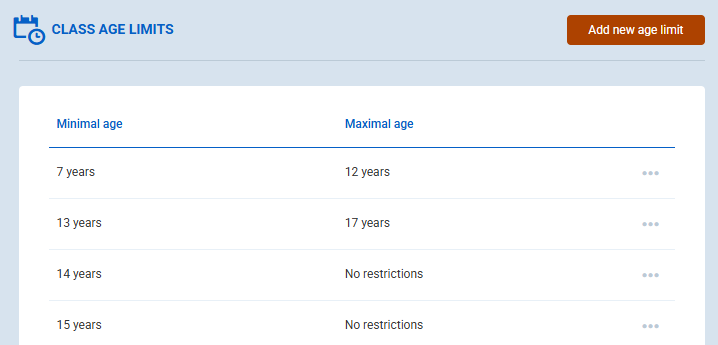 In Perfect Gym, the Age Limits feature allows you to define specific age rules—based on years or months—that restrict or validate user eligibility when signing up for classes, courses, or facility bookings. This tool supports the management of your class configurations, ensuring that only members within the appropriate age range can register for age-specific activities, such as senior yoga, kids' karate, or infant groups.