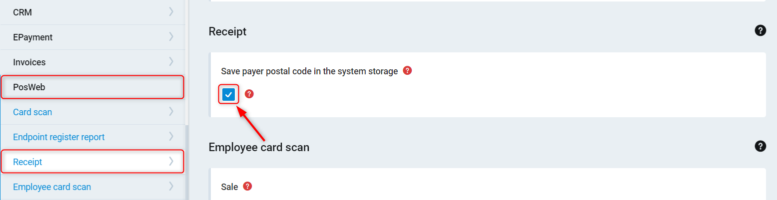 2. Under General Settings, click PosWeb and tick the setting Save payer postal code in the system storage
